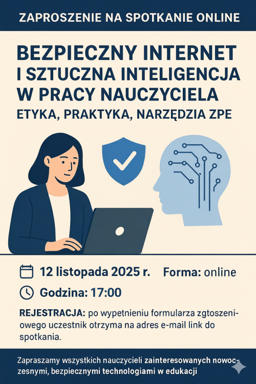 Serdecznie zapraszamy nauczycieli na spotkanie online poświęcone tematyce bezpieczeństwa w internecie oraz wykorzystania sztucznej inteligencji w pracy nauczyciela. Wydarzenie odbędzie się 12 listopada 2025 r. w formie zdalnej, po wypełnieniu formularza zgłoszeniowego uczestnik otrzyma na adres e-mail link do spotkania.