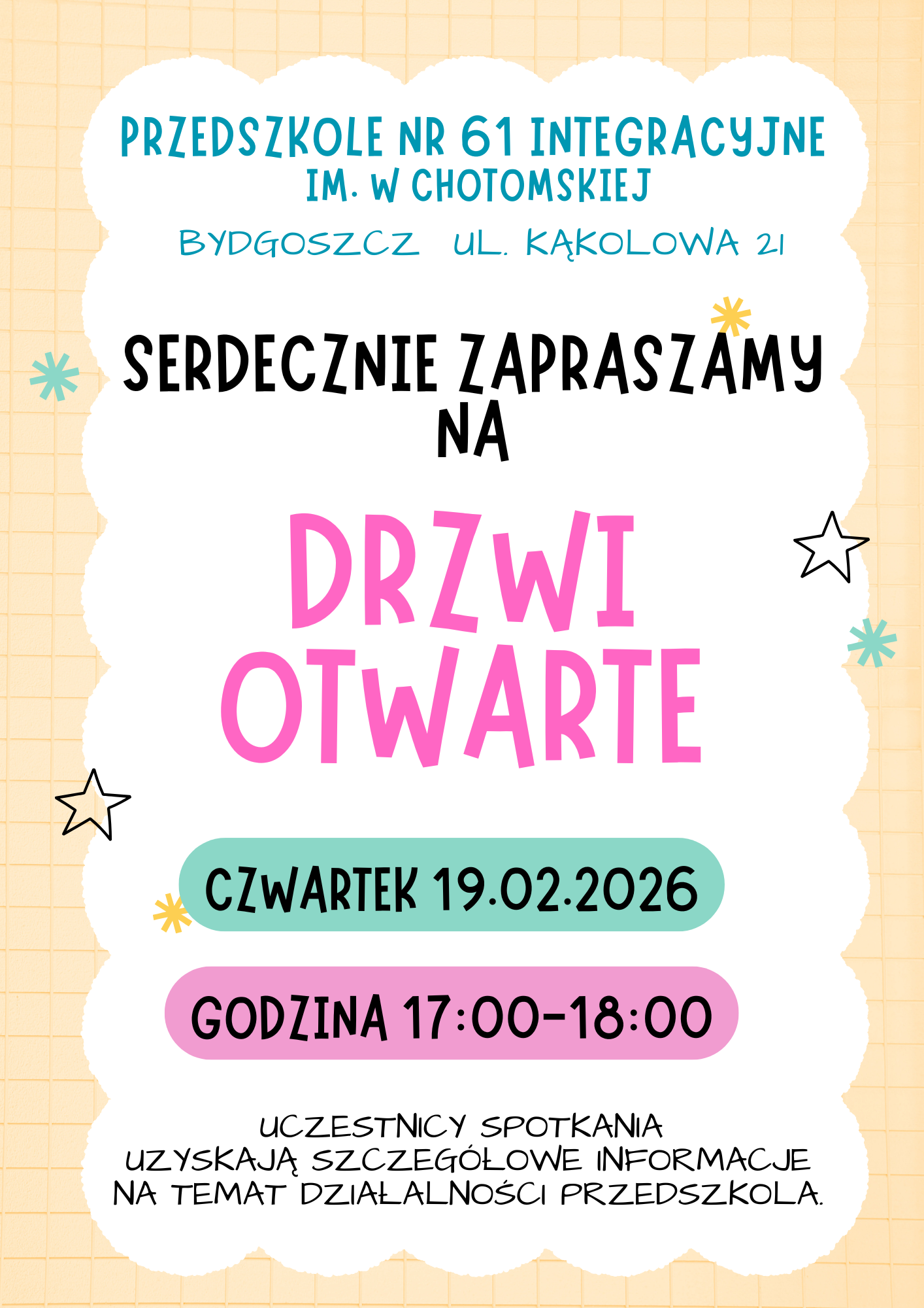 W imieniu Dyrekcji i pracowników Przedszkola nr 61 serdecznie zapraszamy na drzwi otwarte. Szczegóły na plakacie.