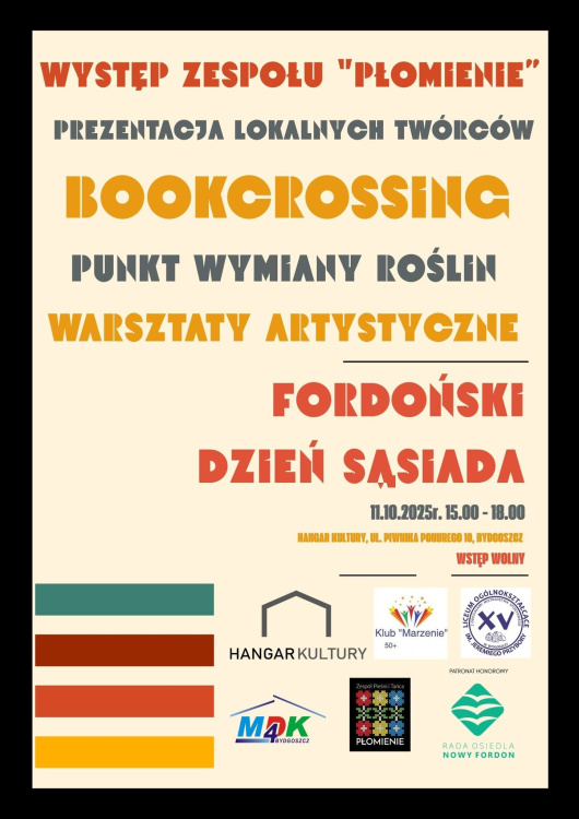 Już w najbliższą sobotę, 11 października 2025 r., w godzinach 15:00–18:00, Hangar Kultury przy ul. Piwnika Ponurego 10 w Bydgoszczy zamieni się w tętniące życiem centrum sąsiedzkiej integracji. Fordoński Dzień Sąsiada to wydarzenie, które łączy pokolenia, promuje lokalne inicjatywy i pokazuje, jak ważna jest edukacja przez kulturę, sztukę i wspólne działanie.