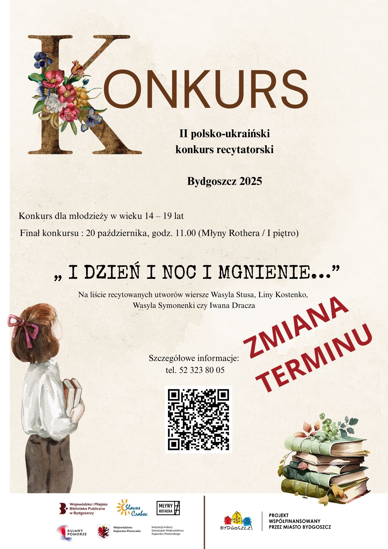Lubisz poezję albo teatr? A może po prostu lubisz recytować i chciałbyś spróbować swoich sił występując przed publicznością? Jeśli tak, to zapraszamy Cię do udziału w polsko-ukraińskim konkursie recytatorskim. Konkurs skierowany jest do uczniów szkół podstawowych (klasy VII-VIII) oraz szkół średnich (klasy I-IV) z Bydgoszczy i regionu.
