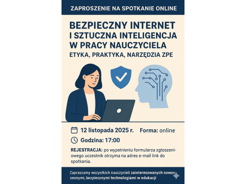Serdecznie zapraszamy nauczycieli na spotkanie online poświęcone tematyce bezpieczeństwa w Internecie oraz wykorzystania sztucznej inteligencji w pracy nauczyciela.