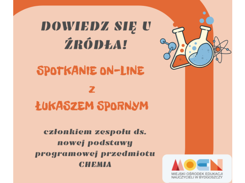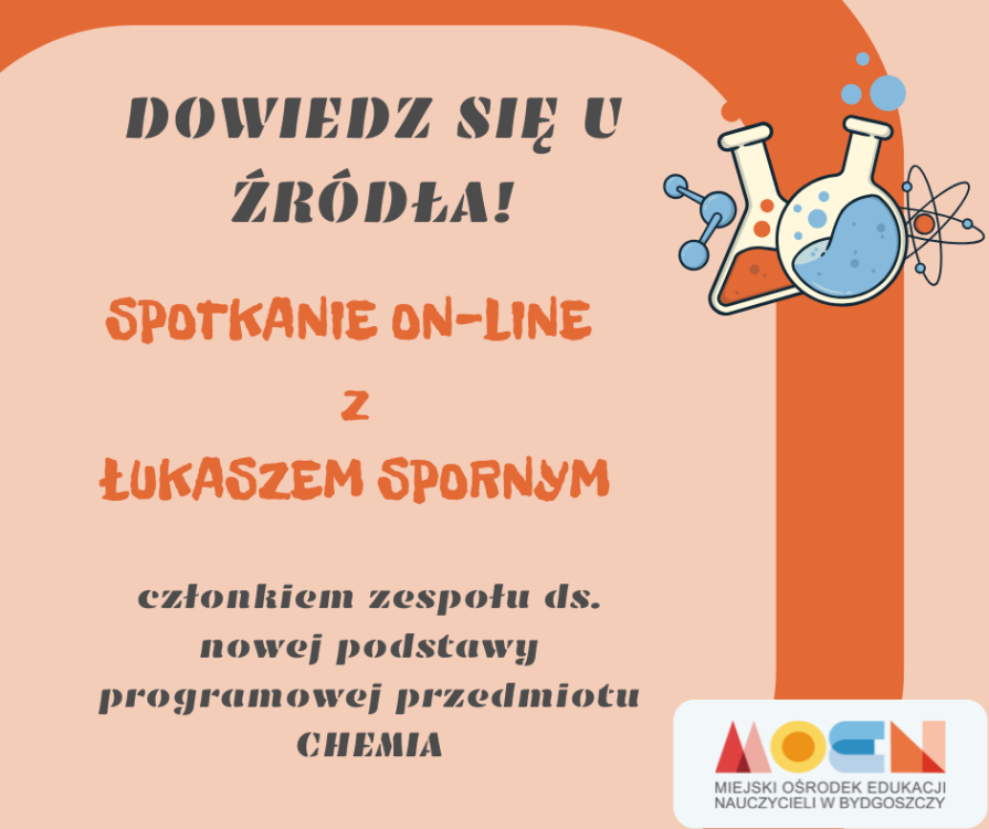 Zapraszamy 4 listopada (WTOREK) o godz. 18:00 na spotkanie on-line z Łukaszem Spornym, członkiem zespołu opracowującego nową podstawę programową z przedmiotu chemia.
