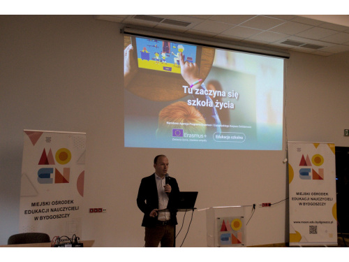 Zebranych gości powitał Dyrektor MOEN, pan Michał Laskowski. W swoim wystąpieniu podkreślił, że projekty Erasmus+ są dziś jednym z najważniejszych narzędzi wzmacniających mobilność edukacyjną, rozwijających kompetencje przyszłości i inspirujących szkoły do wdrażania innowacyjnych rozwiązań dydaktycznych. Zaznaczył również, że sukces projektów nie kończy się na ich realizacji – równie ważne jest upowszechnianie efektów i transferowanie dobrych praktyk do innych placówek.