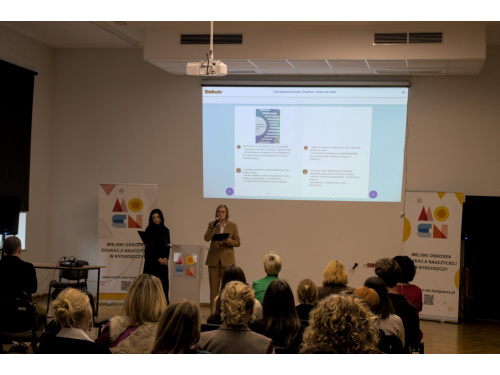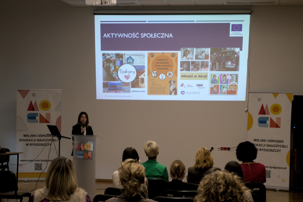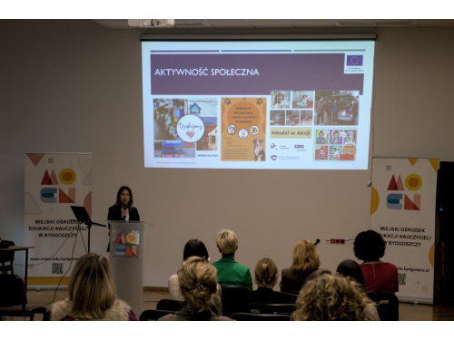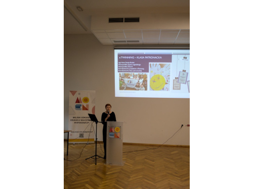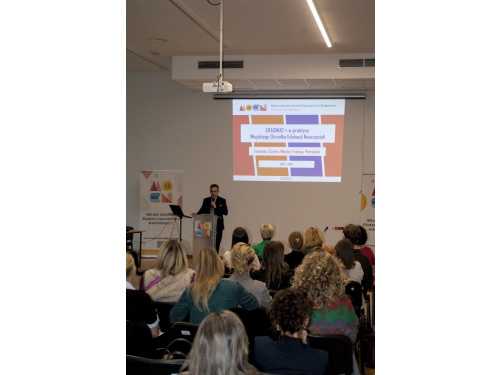 Szkoła Podstawowa nr 41, reprezentowana przez panie Adę Bielawską, Annę Smeję-Robak oraz Joannę Gralak, przedstawiła rezultaty ponad 20-letniej współpracy w ramach projektów międzynarodowych. Szczególne zainteresowanie budziła informacja o zdobyciu tegorocznej nagrody European Innovation Teaching Award 2025 – wyróżnienia przyznawanego za innowacyjne praktyki edukacyjne realizowane w duchu wartości europejskich. Prezentacja pokazała, jak długotrwała i konsekwentna współpraca zagraniczna może realnie przekształcać szkołę, rozwijać jej kulturę organizacyjną oraz motywować całe pokolenia nauczycieli i uczniów.