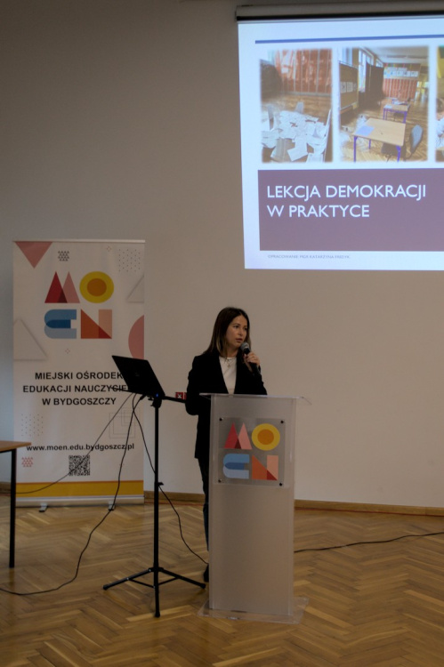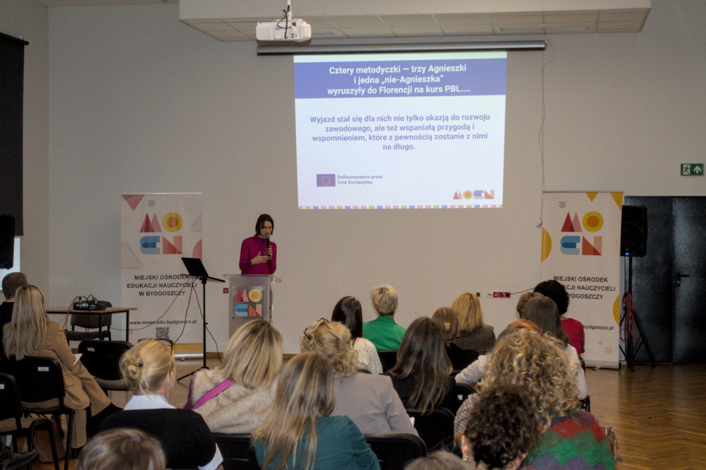 Jako pierwsza wystąpiła pani Kamila Koczorowska, doradczyni ds. chemii w MOEN. Zaprezentowała ona działania realizowane w ramach obecnie trwającego projektu Erasmus+ prowadzonego przez Ośrodek. Skupiła się na zgłębianiu metod CBL (Challenge Based Learning) oraz PBL (Project Based Learning), przedstawiając konkretne przykłady ich zastosowania w codziennej pracy dydaktycznej. Uczestnicy mieli możliwość zapoznania się z wyzwaniami, jakie te metody stawiają przed uczniami, oraz z efektami rozwijania autonomii, kreatywności i pracy zespołowej.