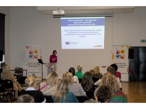 Następnie głos zabrała pani Joanna Gralak, nauczyciel konsultant w MOEN. W swoim wystąpieniu odwołała się do doświadczeń koordynatora projektów i mentora zespołów nauczycielskich. Podkreśliła znaczenie dobrze zdefiniowanych celów, diagnozy potrzeb placówki oraz tworzenia planów, które nie tylko wspierają rozwój uczniów, ale także wzmacniają kompetencje nauczycieli i stabilność organizacyjną szkoły. Zwróciła uwagę, że właściwie przygotowany lider potrafi mobilizować społeczność szkolną i skutecznie zarządzać wyzwaniami projektowymi.