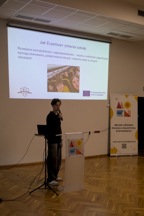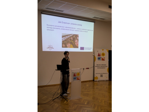 Następnie zaprezentowało się VI Liceum Ogólnokształcące. Koordynatorka projektu, pani Joanna Lisewska, wraz z uczniem Michałem Barańskim przedstawiła rezultaty działań w ramach akredytacji Erasmus+. Wystąpienie skoncentrowało się na rozwoju edukacji językowej, wzmacnianiu kompetencji interpersonalnych oraz budowaniu postawy europejskiej wśród młodzieży. Uczniowie liceum korzystają z programów mobilności, dzięki którym poznają inne systemy edukacyjne, otwierają się na różnorodność kulturową i zdobywają praktyczne umiejętności potrzebne w dalszej edukacji i życiu zawodowym.